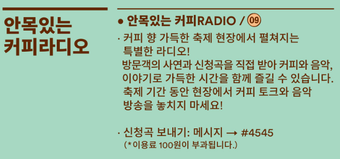 또한 별의별 원두상점에서는 드립백과 로스팅 원두 구매도 가능하며, 커피 라디오에서는 관람객의 사연과 신청곡이 현장에서 실시간으로 방송돼요. 문자(#4545)로 신청하면 내 사연이 라디오로 나올 수도?!