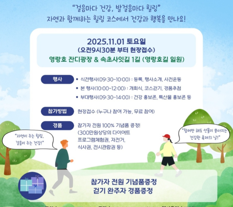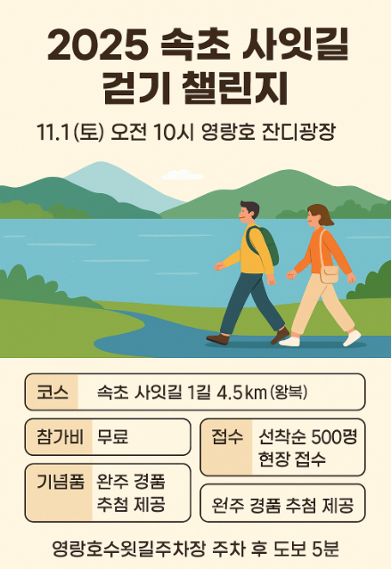 오늘은 자연과 힐링이 함께하는 2025 속초 사잇길 걷기 챌린지에 대해 알아보았습니다. 영랑호의 아름다운 풍경을 배경으로 한 4.5km 걷기 코스, 참가비 없는 자유로운 참여, 그리고 기념품과 푸짐한 경품까지! 건강도 챙기고, 추억도 남길 수 있는 가을 걷기 행사로 손색이 없습니다.