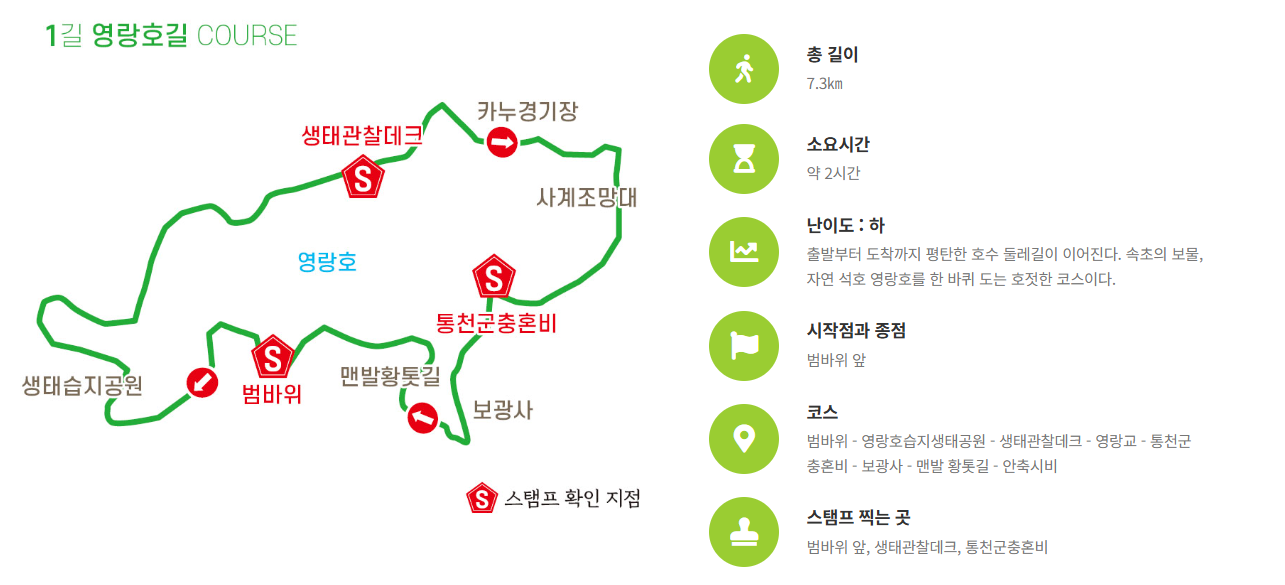 | 코스 | 속초사잇길 1길(영랑호길) 4.5km 왕복 |