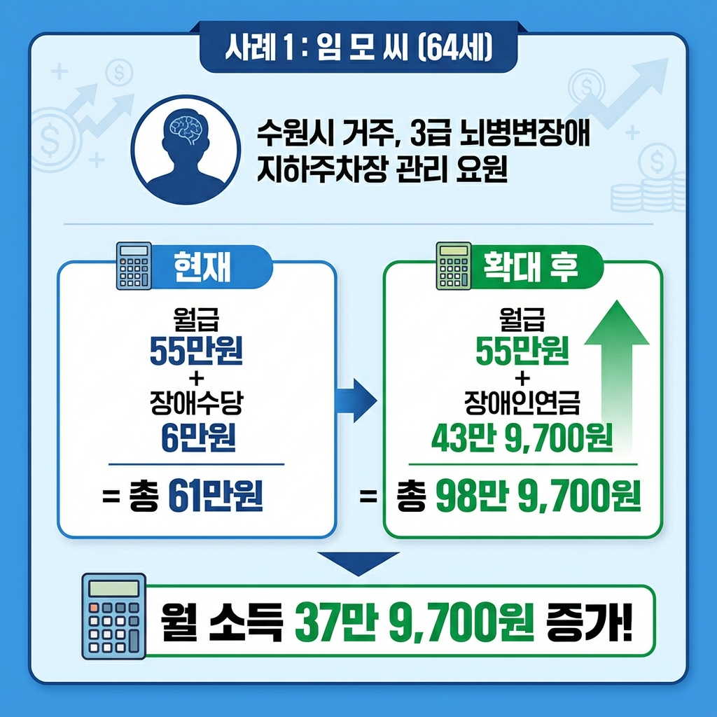 장애인 연금 3급 확대 후: 월급 55만원 + 장애인연금 최대 43만9700원