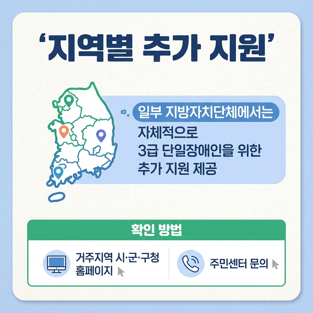 일부 지방자치단체에서는 자체적으로 3급 단일장애인을 위한 추가 지원을 제공하고 있습니다. 거주지역 시·군·구청 홈페이지나 주민센터에 문의하시면 지역별 혜택을 확인하실 수 있습니다.