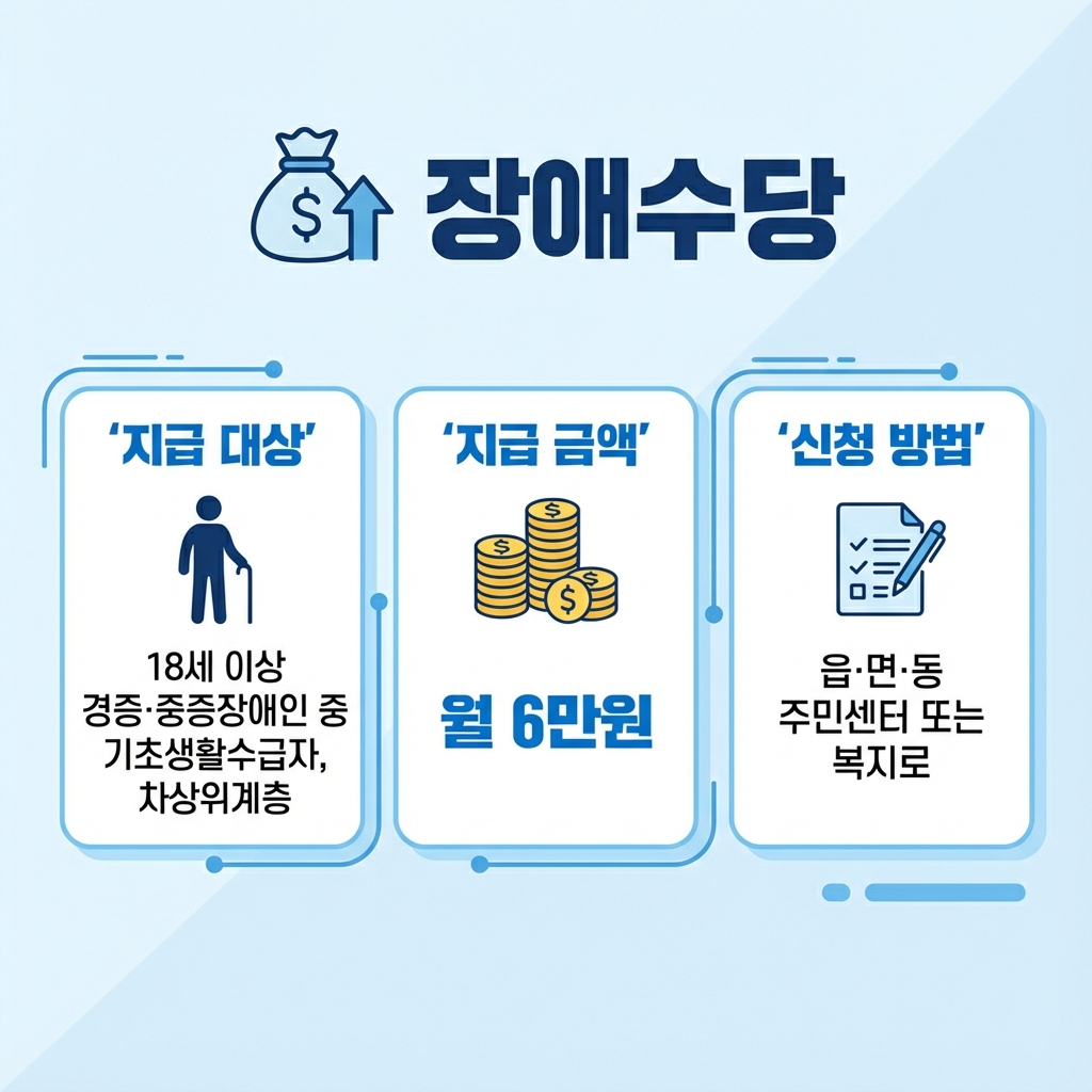 • 지급 대상: 18세 이상 경증·중증장애인 중 기초생활수급자, 차상위계층