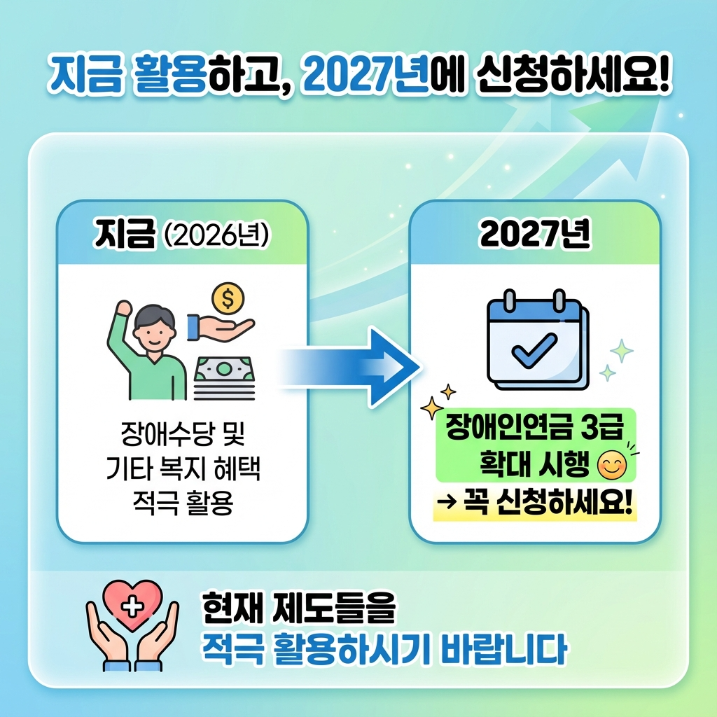 장애인 연금 3급 확대가 시행되기 전까지는 이러한 제도들을 적극 활용하시고, 2027년에는 꼭 장애인연금을 신청하시기 바랍니다.