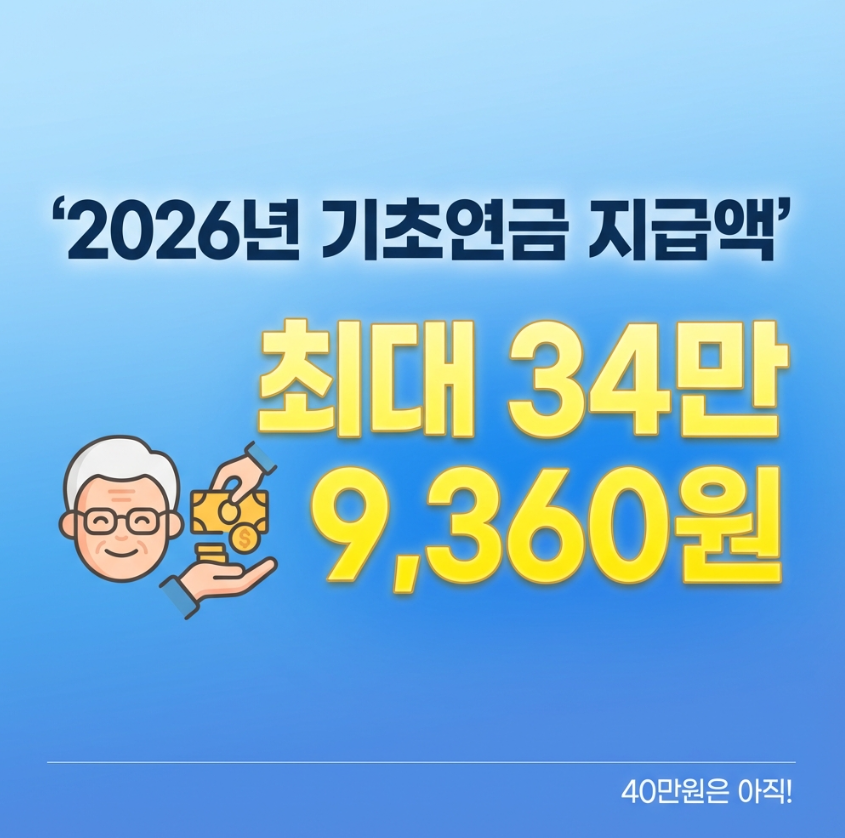 2026년 기초연금 지급액은 단독가구 기준 월 최대 34만 9,360원입니다. 이는 2025년 34만 2,510원에서 6,850원 인상된 금액입니다. 많은 분들이 "기초연금 40만원"이라고 알고 계시지만, 2026년 현재는 아직 40만원에 도달하지 않았습니다.