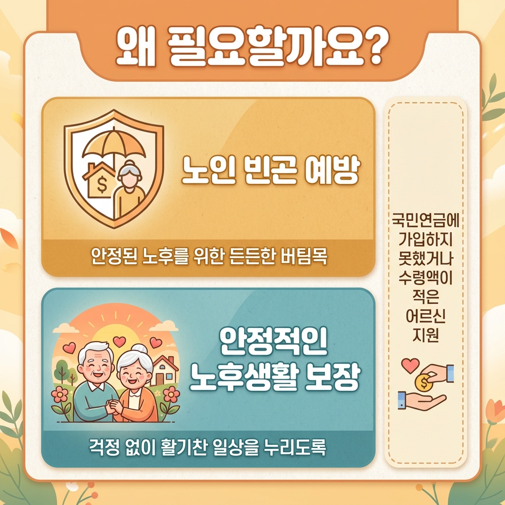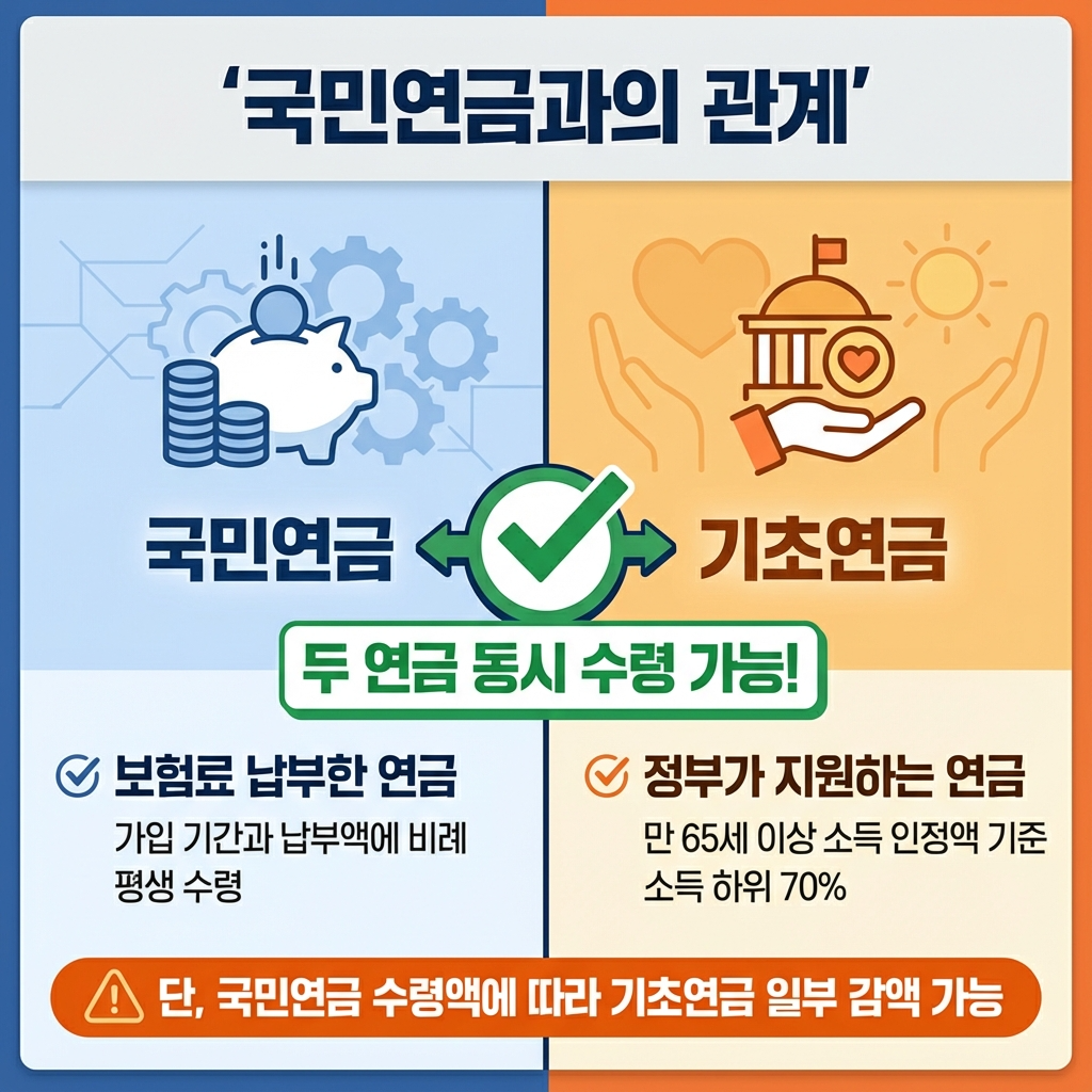 기초연금의 핵심 목적은 노인 빈곤을 예방하고 안정적인 노후생활을 보장하는 것입니다. 국민연금과는 별개의 제도로, 두 연금을 동시에 받을 수도 있습니다. 다만, 국민연금 수령액에 따라 기초연금이 일부 감액될 수 있습니다.