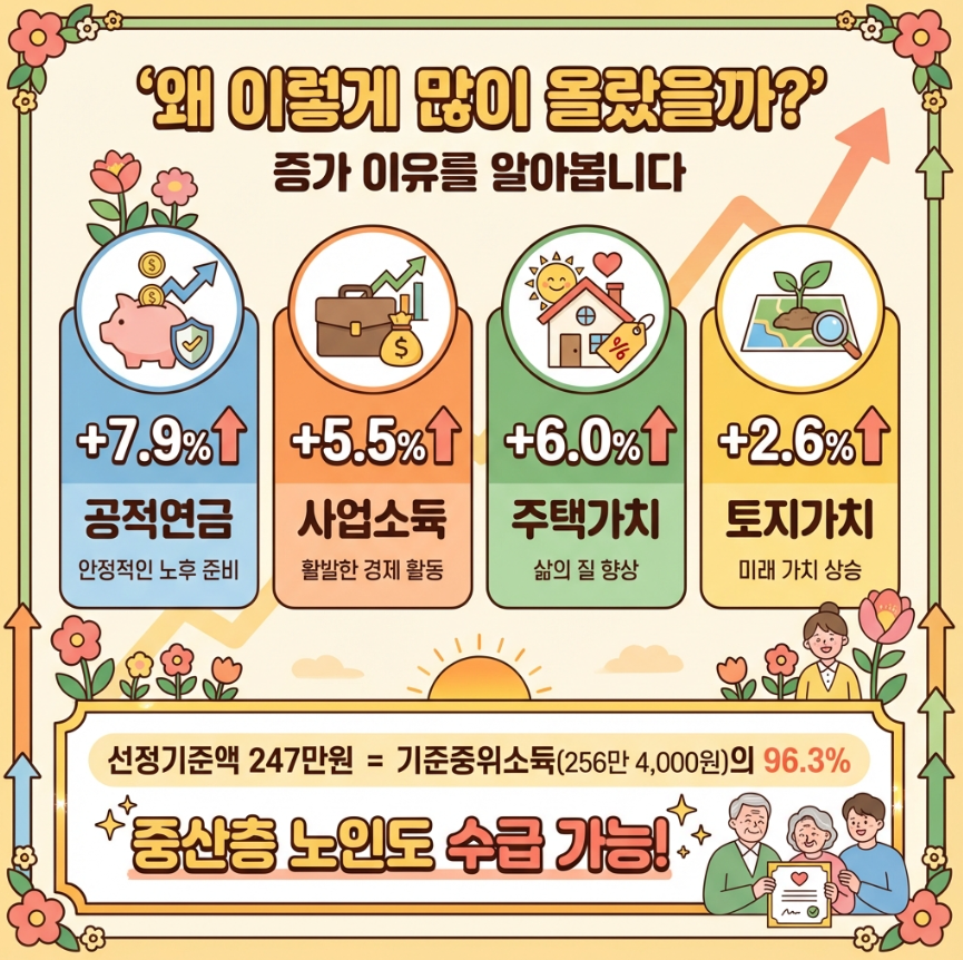 2026년 선정기준액이 대폭 인상된 이유는 65세 이상 노인의 소득과 재산 수준이 빠르게 향상되었기 때문입니다. 공적연금 소득은 7.9%, 사업소득은 5.5% 상승했고, 주택과 토지의 자산가치도 각각 6.0%, 2.6% 상승했습니다.