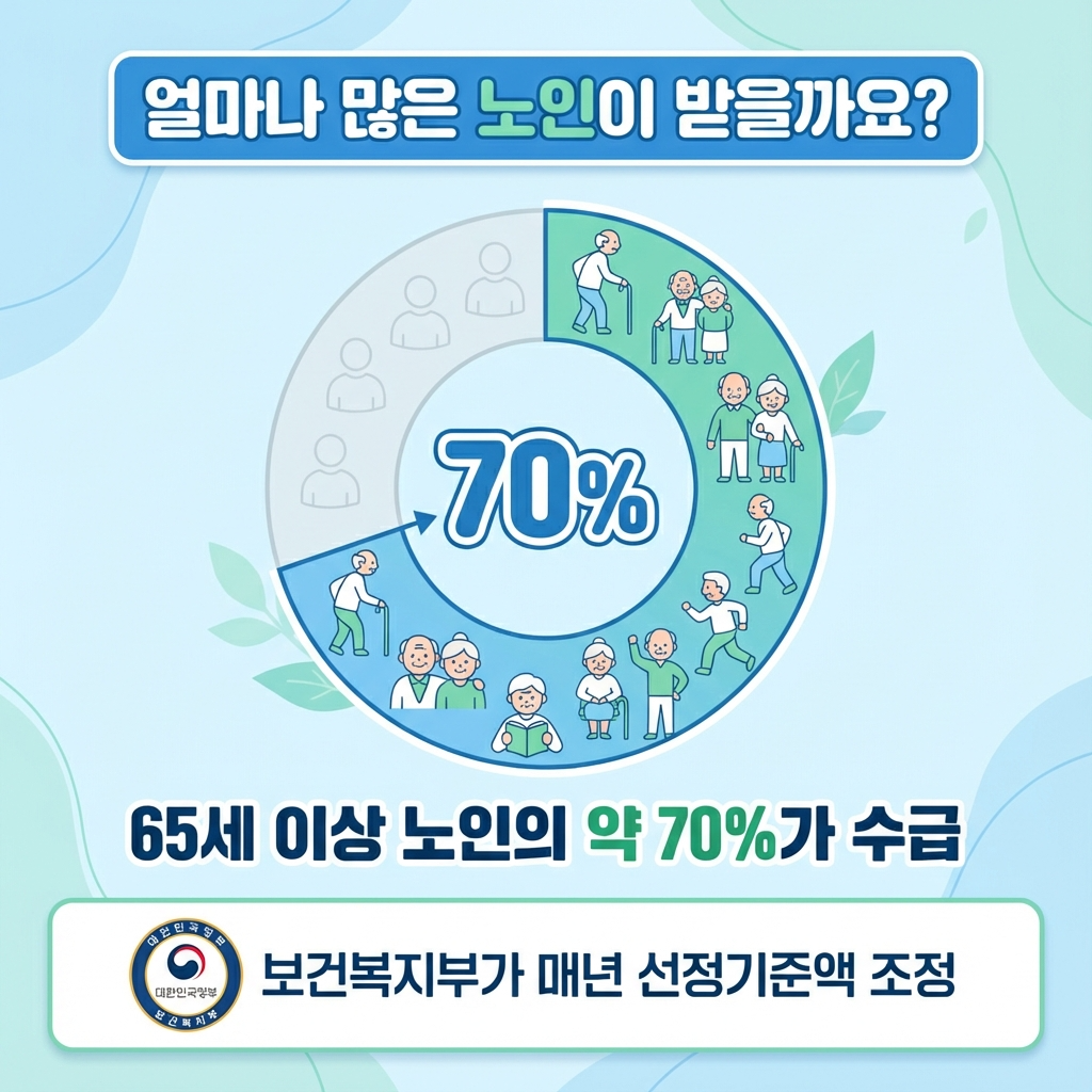 2026년 현재 기초연금 수급자는 전체 65세 이상 노인의 약 70% 수준으로, 대부분의 노인이 혜택을 받고 있습니다. 보건복지부는 매년 선정기준액을 조정하여 노인의 소득과 재산 수준 변화를 반영하고 있습니다.