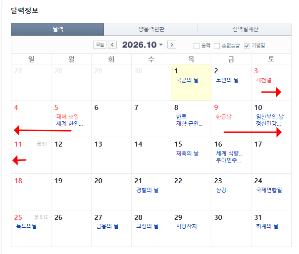 • 10월: 3~5일 (개천절 2026년 대체공휴일 포함, 3일)